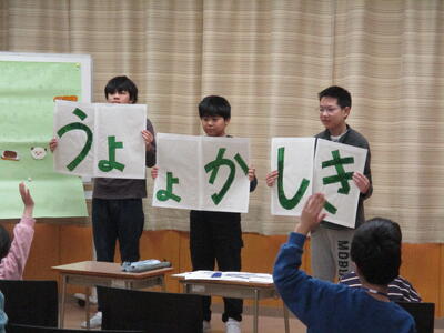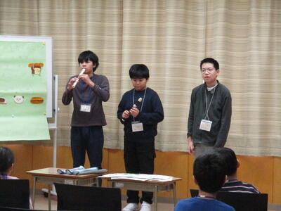 本校の児童は、言葉の並べ替えクイズとリコーダークイズをしました。