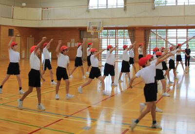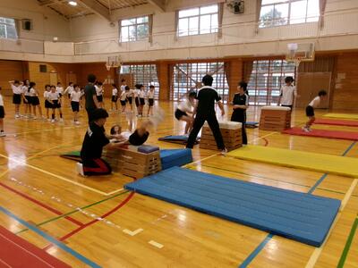 跳び箱のための準備運動を行った後、自分にあった跳び箱を選んで練習しました。苦手な人は跳べるように、得意な人はもっときれいに跳べるように指導をしてもらいました。子どもたちは、とても上達して満足そうでした。教職員の指導法の研修機会にもなりました。