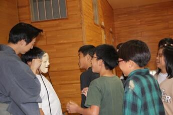 能の歴史や価値を学んだあと、能の動きや発声などを一緒に行いました。またいつも手に取ることができない、能面を間近に見せていただいたり、顔に着けたりもさせていただきました。