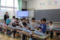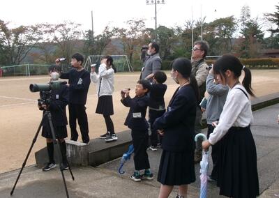 双眼鏡の使い方を教えていただいて、まずは校舎内から鳥を探しました。カラスやサギ、カモなどを観察することができ、特徴や生態なども教えていただきました。その後、校舎の外に出て観察活動を行いました。よく見知っている鳥でも、じっくり観察したり生態について調べたりする機会はなかなかありません。分かりやすく野鳥の会の方に教えていただき、子どもたちは知識だけでなく中海の自然への興味も増えたようでした。