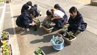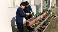 緑の少年団の活動として、6年生が正面玄関前のプランターに花の苗を植えました。色とりどりのパンジー、ノースポール、松葉ボタンの苗です。校務員さんと一緒に作業をしました。