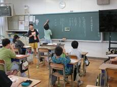 暑い日が続き、体育の時間に水泳学習がんばっています。1年生は1回目に6年生と一緒に入りました。6年生は手をつないでシャワーに向かったり、やさしく水慣れできるように水をかけたりしていました。お互いに楽しんでいました。