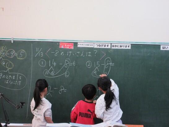 1年生の算数では、くり上がりのあるたし算の勉強をしていました。タブレット上に自分の考えを表し、モニターの前に出てきて説明をしていました。勉強がだんだん難しくなってきましたが、いっしょうけんめい頑張っている1年生の姿に成長を感じました。