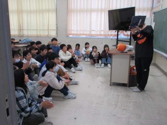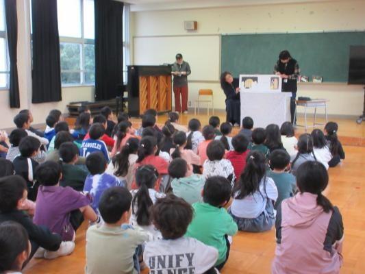 昼休みに図書委員会が紙芝居をしてくれました。1~3年生は、最後まで楽しんで参加していました。読み手の図書委員会の子たちは、よく練習してあり、間の取り方や聞き手に問いかけながらの読み方が上手で感心しました。