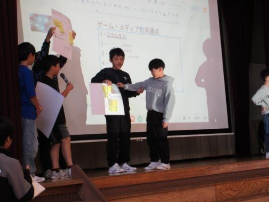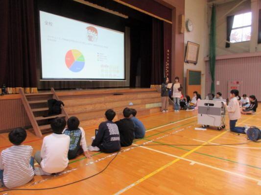 昼休みに図書委員会が紙芝居をしてくれました。1~3年生は、最後まで楽しんで参加していました。読み手の図書委員会の子たちは、よく練習してあり、間の取り方や聞き手に問いかけながらの読み方が上手で感心しました。
