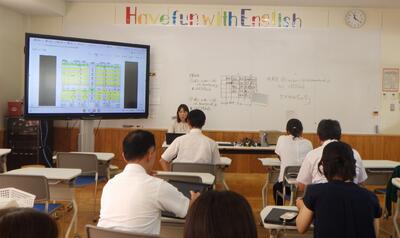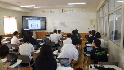 9年生は英語。黒板にも画面モニターもすべて英語。難しくなってきますが,何回も聞いて,見て,慣れるよう頑張っていました。