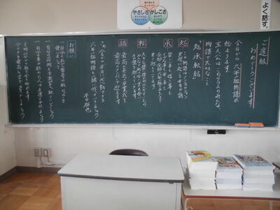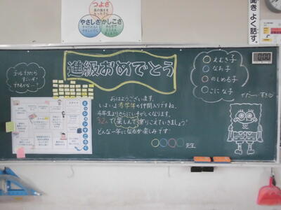 各学級担任がそれぞれ新しく受け持つ子どもたちのために、ウェルカム黒板を心を込めて準備し、