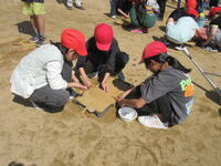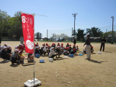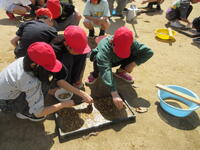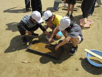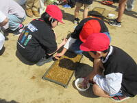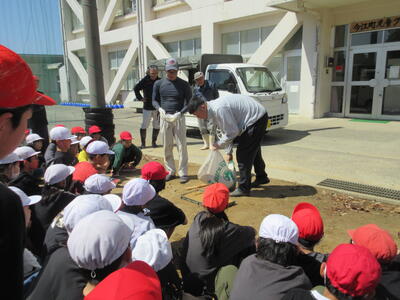 4月16日に、5年生がお米の種まきをしました。毎年田植え・稲刈体験にご協力いただいている生産組合の方、地域の方、JAの方等、あわせて約10名の方が来てくださいました。実演を交えながら、種まきの仕方を丁寧に教えてくださいました。お話を聞いた後、5年生はグループに分かれて、種まき作業を行いました。