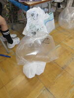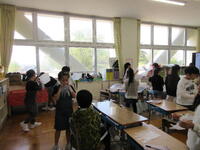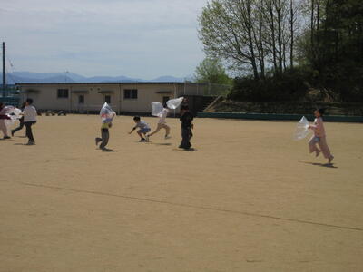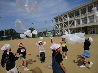 4月14日の図工の時間、3年生は両クラスとも「ふわふわ空気をつんでつなげて」の学習をしていました。いろんな袋に空気を入れて、どんなことができるのか・・・袋をつなげたり、透明なビニール袋の中に色画用紙を切って入れたり・・・楽しくつくっていました。製作の後は、青空の下、広い運動場で飛ばしてみて、みんなとっても楽しそうでした。