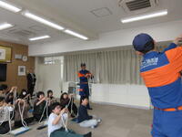 はじめに、消防団の方から、今江校下を守る「第8御幸分団」のことやその役割、小松市の災害の歴史、今江校下の災害や危険箇所等についてお話をお聞きしました。その後、3つのグループに分かれて、「ロープ結索体験」「放水体験」「119番通報体験」を行いました。
