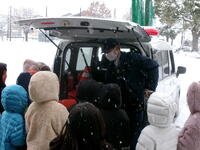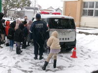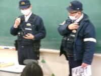 社会科の学習で、明峰交番の警察官の方に来ていただき、警察の仕事について学習しました。警察官が持っている無線などの貴重なものやパトカーの中を見せていただきました。交番は24時間体制で町の安全を守ってくださっていることもわかりました。