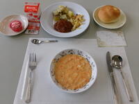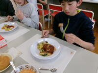 スプーン、ナイフ、フォークを使った食事の仕方やマナーについて学びました。事前に稚松小の栄養士の先生のお話を聴いた後、いざ実食!音は立てない、一口大に切る、周りとペースを合わせて食べるなど慣れないことで緊張した様子でしたが、おいしくいただきました。公共の場に出た時に役立ててほしいです。
