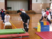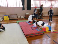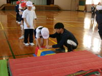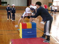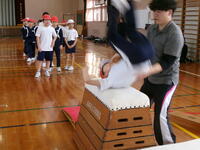 K's体操クラブの先生に、開脚跳びと台上前転の技のポイントや練習の仕方を教えてもらいました。みんな意欲的に練習に取り組み、それぞれ自分に合った場で、開脚跳びは全員跳べるようになりました。台上前転はこれから体育の時間で練習を重ねて、できるようになるといいですね。