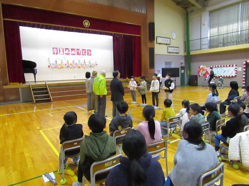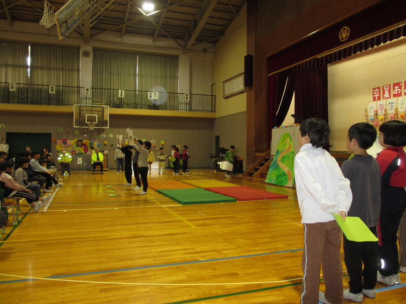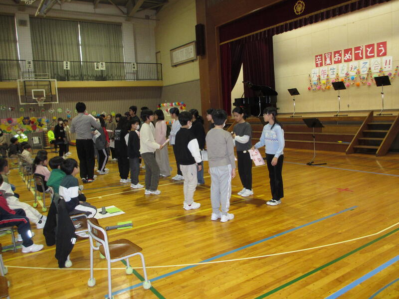 2月27日に普段からお世話になっているわが町防犯隊や図書ボランティアの方々をお招きした「感謝の会」と、「6年生を送る会」を実施しました。5年生の企画・運営で計画してきた6年生を送る会では、6年生への感謝・卒業お祝いメッセージを盛り込んだ各学年の発表がありました。