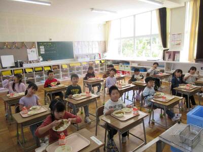 1年生が小学校で初めての給食を食べました。この日のメニューは、カレーライスとフルーツヨーグルト。みんな「おいしい!」とカレーをパクパク。おかわりする子もいました。牛乳パックの開け方も先生に教えてもらって、チャレンジ。準備の仕方も少しずつ覚えていこうね。
