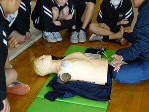 講話の後、人形を用いてAEDの使い方や心臓マッサージについて実践しました。