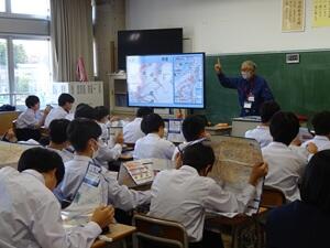昨日は、地域の防災士を招いて、南部地区の災害危険度や避難所運営のことなどを話していただきました。生徒たちは、防災マップを見て、自宅の危険度を把握したり避難所を確認したりしていました。防災士からは、避難所が設置されたときは、中学生も運営にかかわってほしいなどの話がありました。防災士からの話を受けて、今後も地域の課題について考えていきます。