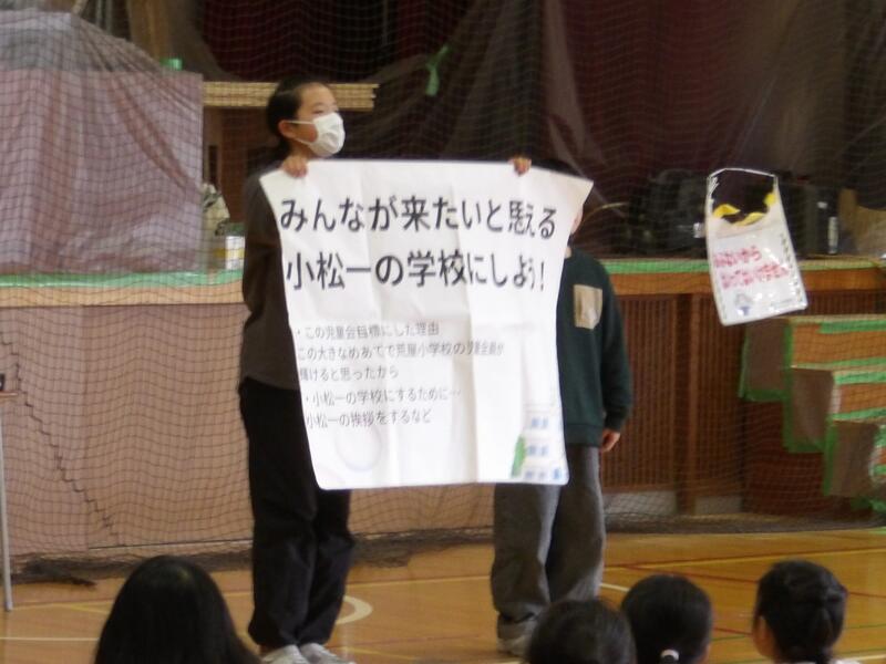 前期児童会目標は「みんなが来たいと思える小松一の学校にしよう!」。集会後、各学級では、みんなが来たいと思う学校にするためにクラスでできることを考える姿がありました。