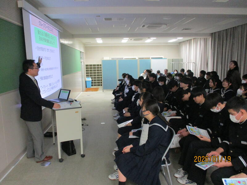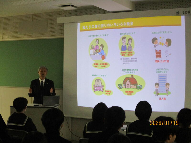 1月19日(月)に3年生の租税教室が行われました。税のプロをお招きし、日本の税金や財政について詳しくお話しして頂きました。税金にはいろいろな種類があって、大人だけでなく中学生の皆さんも買い物をした時に支払っています。その税金は全部合わせると想像もつかない金額になるのですが、一体どのように振り分けられ使われているのでしょうか。