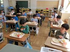 1年生の給食が始まりました。初日のメニューは、カレーライスとフルーツヨーグルト、牛乳でした。初めての給食当番の仕事も順序良く行い、おいしそうに食べていました。