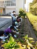 1回目は、全校みんなで、小松市から届いたパンジーやビオラの花苗を学校の花壇に植えました。みんなで植えた花は大きくきれいに成長しています。