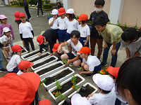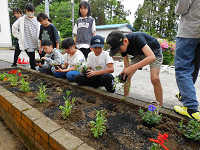 花苗を学校の花壇に植えました。みんなで植えた花は、