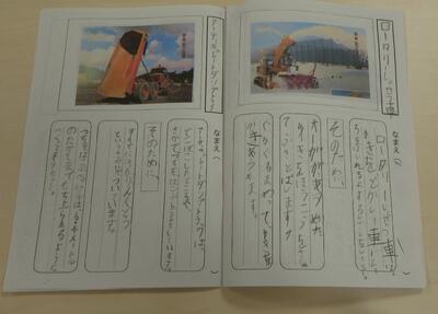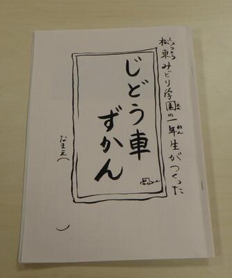 1年生は国語の授業で「自動車図鑑」をつくりました。「そのために」を使って、自分が選んだ自動車の説明文をがんばって作りました。