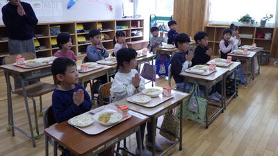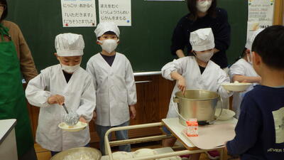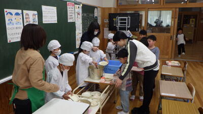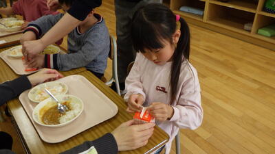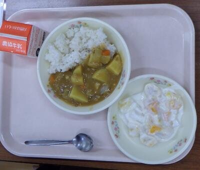 今日から1年生の給食が始まりました。メニューは「カレーライス」と「フルーツヨーグルト」。子どもたちに人気のメニューとあって、大盛りにする子も何人もいました。