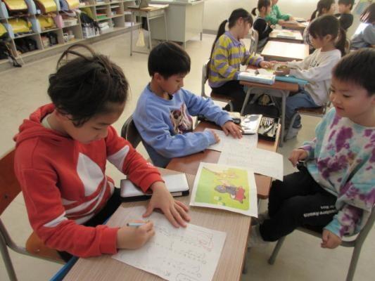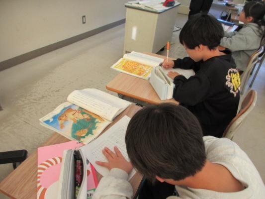 1年生は、国語の学習でお話づくりをしていました。絵を見てストーリーを想像し、お話を作っています。友達と一緒に作ったり一人で作ったり しています。