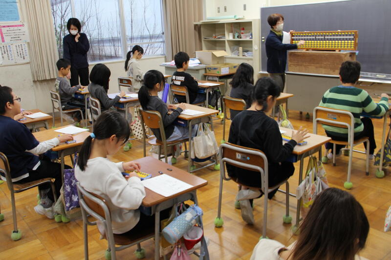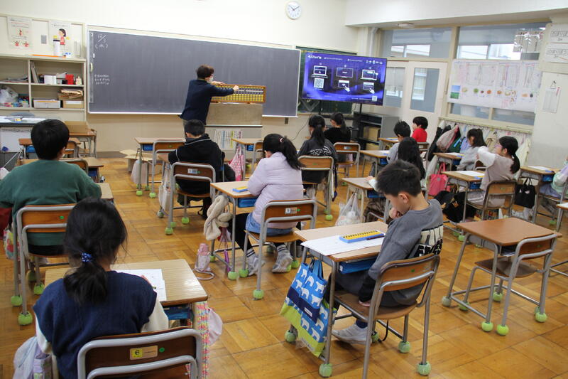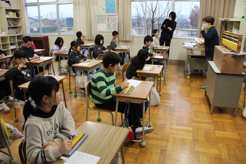 12月2、3日の2日間、3年生がそろばんの先生 南口さんをお迎えし、そろばんの使い方を習いました。各クラス2時間の学習でしたが、最後には簡単なたし算・ひき算の計算をそろばんを使ってやってみました。やり方がわかり、自分でそろばんを使って計算できた時には、とてもうれしそうでした。