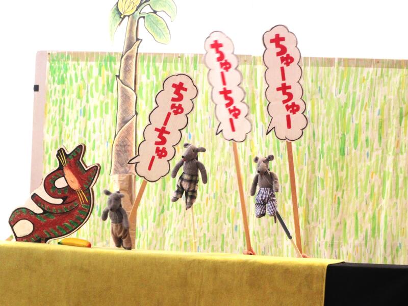 朝から多目的ホールで準備しているボランティアさんを見て、子ども達はわくわくドキドキ。お昼休みのお話会には、たくさんの子ども達が来ました。今回のお話はペープサート劇『ちゅーちゅー』。お話の世界に入り込み、楽しむことができました。