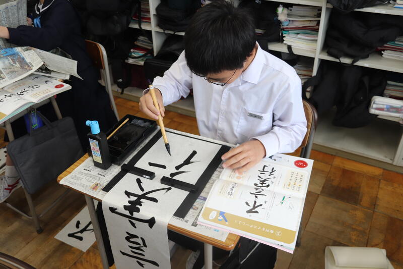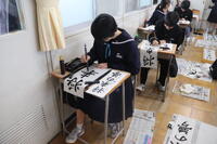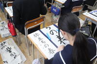 1月8日、3学期の始業式後に、各学年で書き初め大会が行われました。1年生は「不言実行」、2年生は「将来の夢」、3年生は「旅立ちの春」をそれぞれが思いを込めて長半紙に書き込みました。自分の心と静かに向き合い、よりよくなるよう、どの生徒も真剣な表情で作品を仕上げていました。