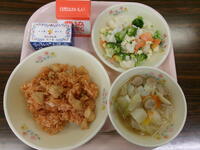 献立はチキンライス、コンソメスープ、チーズサラダ、クリスマスデザート、牛乳です。チーズサラダのチーズは小さなかわいい星形でした!クリスマスデザートの箱には”おたのしみケーキ”とありました。みんなワクワクしながら箱を開けておいしくいただきました。