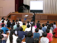 ドリブルやシュートを教えてもらった練習の後、「サムライズのお二人+5・6年担任チーム」VS「各学年10人程チーム」で試合をしました。現役のプロ選手の放つダンクシュートにみんな大興奮でした。