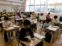 冬休み明けに行う「書初めの会」に向けて、どの学年も練習が始まっています。今日は1年生と5年生が取り組んでいました。1年生は硬筆、5年生は毛筆です。