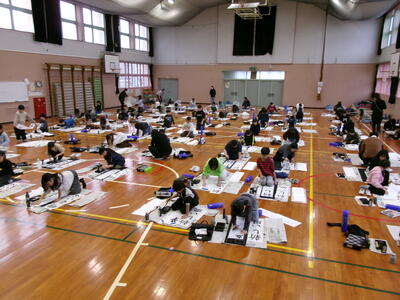 書初めの会は、1・2年生は教室で、3・4・5・6年生は体育館で行いました。シーンとした緊張感の中、集中して取り組んでいました。