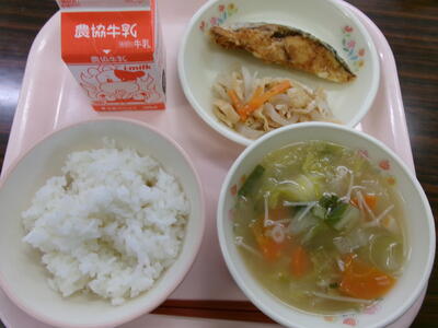 今日から給食が始まりました。今日は、お正月にちなんだ献立で、ご飯、牛乳、白玉雑煮、ぶりの竜田揚げ、紅白なます、でした。小さな白玉がたくさん入っていました。