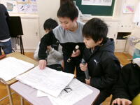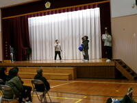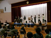安宅小学校で、能美小、荒屋小、安宅小、安宅中の友だちと交流しました。日頃の学習を発表したり、卒業生を祝ったりしました。