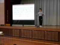 英文を暗記して披露するという、5・6年生対象のコンテストが明日行われます。本校からは5年生1人、6年生1人が応募し出場します。明日の本番を前に、今日はリハーサルも兼ねて全校で応援の会を開きました。ふたりとも身ぶり手ぶりをつけて堂々と表現していました。ふたりのチャレンジとこれまでの努力に全校で拍手を送りました。あしたもがんばれ!