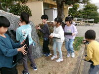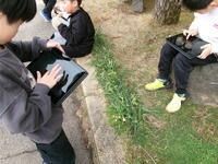 運動場で端末を持って、自然ビンゴカードにあるものを探していました。カードには、くものす、つるつるしたもの、ざらざらしたものなどが書かれていて、見つけたら写真に撮っていました。秋に植えたチューリップが芽を出しはじめ、「チューリップの芽がつるつるやったよ!」と嬉しそうに教えてくれました。五感を使って感じるって大事ですね。