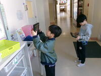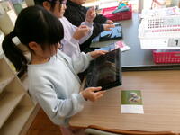1年生が授業中、端末を持ってろうかをウロウロ。「何してるの?」とたずねると「1から100までのすうじをさがしている!」とのこと。見つけた数字を端末のカメラで撮っていました。算数の「大きな数」の学習です。小さな数字はたくさん見つかるけど、大きな数字はなかなか見つからなかった様子。家でも探してくるようです。