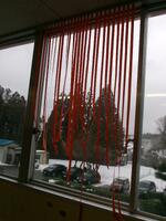 2年生が「100cmをこえる長さ」の学習で、両手を広げた長さや、いろいろな物の1mをこえる長さをはかりました。そこで1mの長さはどれぐらいかをものさしを使わずにテープで表してみました。量感を身につけることは大切なことです。それを全校にも呼び掛けて、めざせ1mピタリ賞を行っています。たくさんの人が挑戦していますが、1cm差の惜しい人はいますが、まだピタリ賞はいません。私も挑戦します!