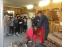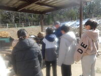 5年生が木場潟公園東園地で里山再生について学びました。里山再生の必要性について学び、間伐材をペレットにする過程や、実際にペレットを燃やすところを見学しました。