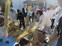 5年生が稲刈りをしたお米の脱穀体験をしました。