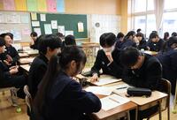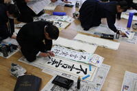 その後、毎年恒例の「書き初め大会」を行いました。これまでの練習の成果を発揮しようと、どの生徒も一文字一文字を丁寧に書いていました。