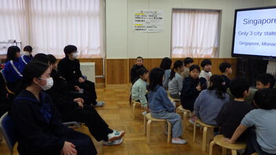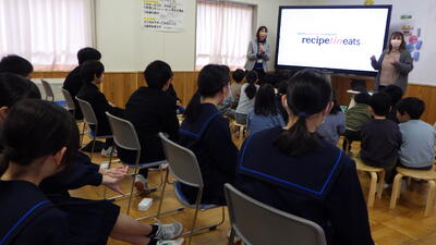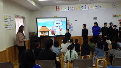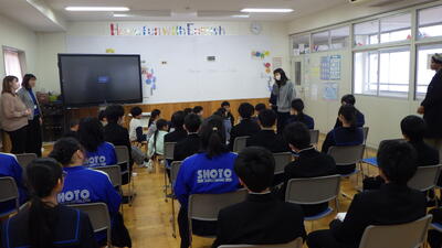 後半は、7年生が創作したオリジナル昔話~英語バージョン~を紹介してくれ、1年生は大喜び!もちろん説明も英語です。最後に1年生の担任の先生からも講評をもらいました。