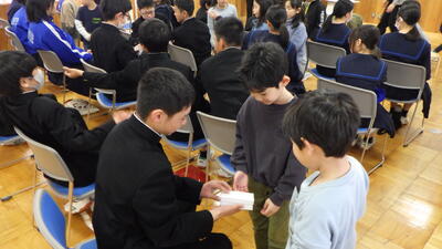 今日は、前期課程による「感謝の会」がありました。5・6年生が中心となって、図書ボランティアさんやわが町防犯隊の方々をお迎えし、日頃の感謝を伝えました。1・2年生作成の感謝のメダルや全校からの感謝の手紙を渡し、クイズ大会で盛り上がりました。