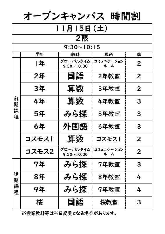 〇授業参観(2限目)の時間割について