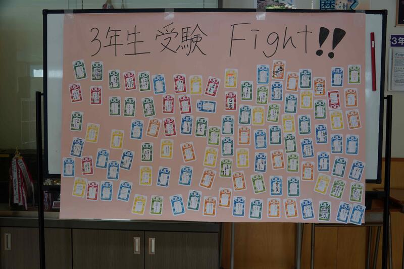 リーダー会が中心となって呼びかけ、1、2年生全員で3年生の合格を願ってメッセージを書きました。玄関前でじっくり読む3年生もたくさんいます。受験に向けて大変な時期ですが、みんな応援しています。春には笑顔の花が咲きますように。