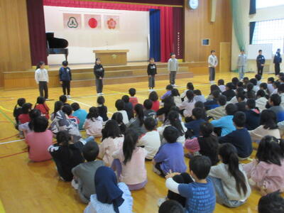 不審者対応の避難訓練を行いました。6年生の代表が上手に不審者と対応していました。